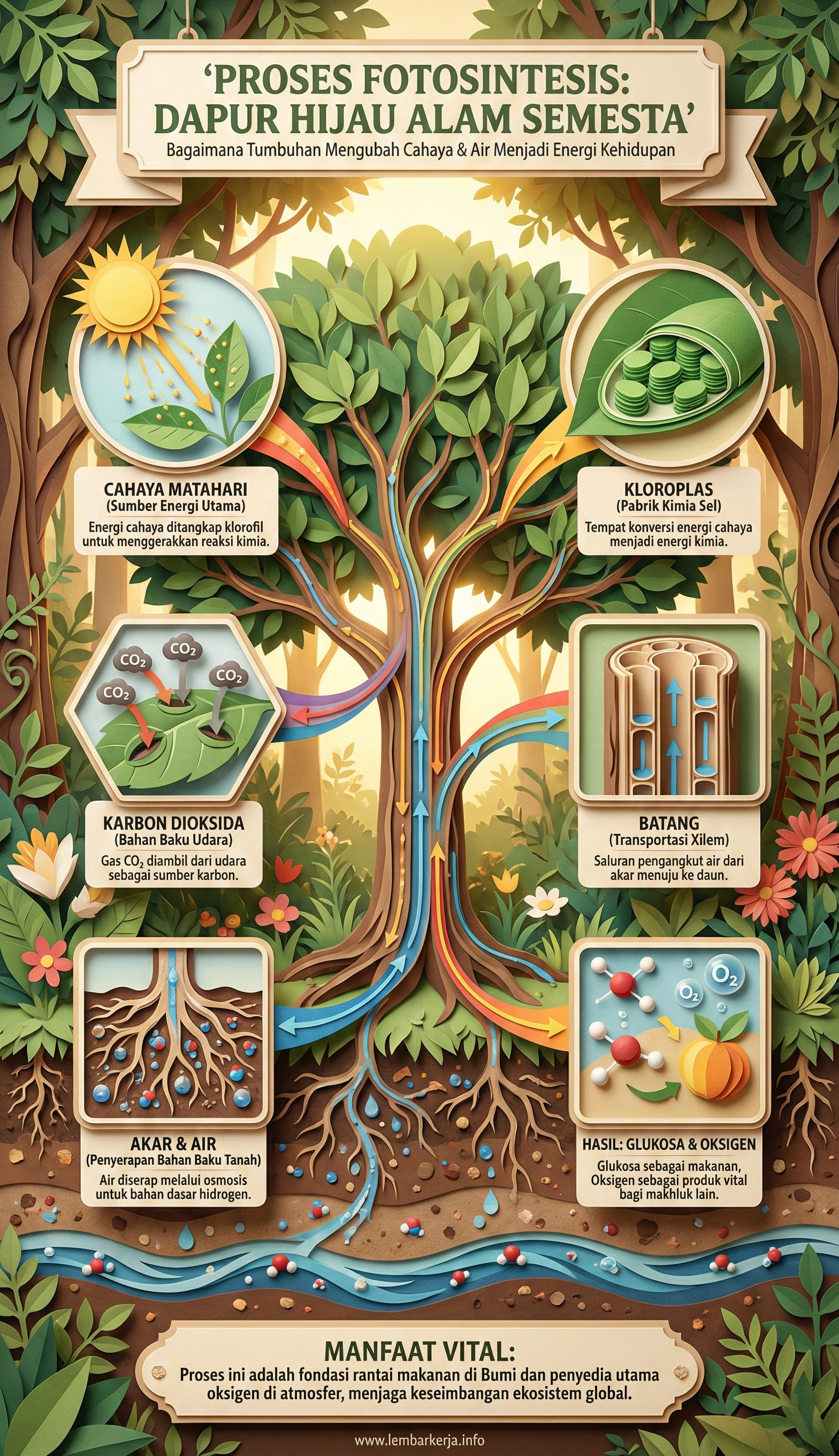 Poster ini sangat mendukung pembelajaran berbasis visual (visual learning) bagi siswa sekolah dasar maupun menengah. Dengan memahami bahwa proses ini berulang terus-menerus selama ada cahaya, anak akan lebih menghargai keseimbangan ekosistem global. Media ini sangat fungsional untuk dipasang di ruang belajar atau laboratorium sekolah sebagai referensi cepat yang informatif dan mudah diingat.